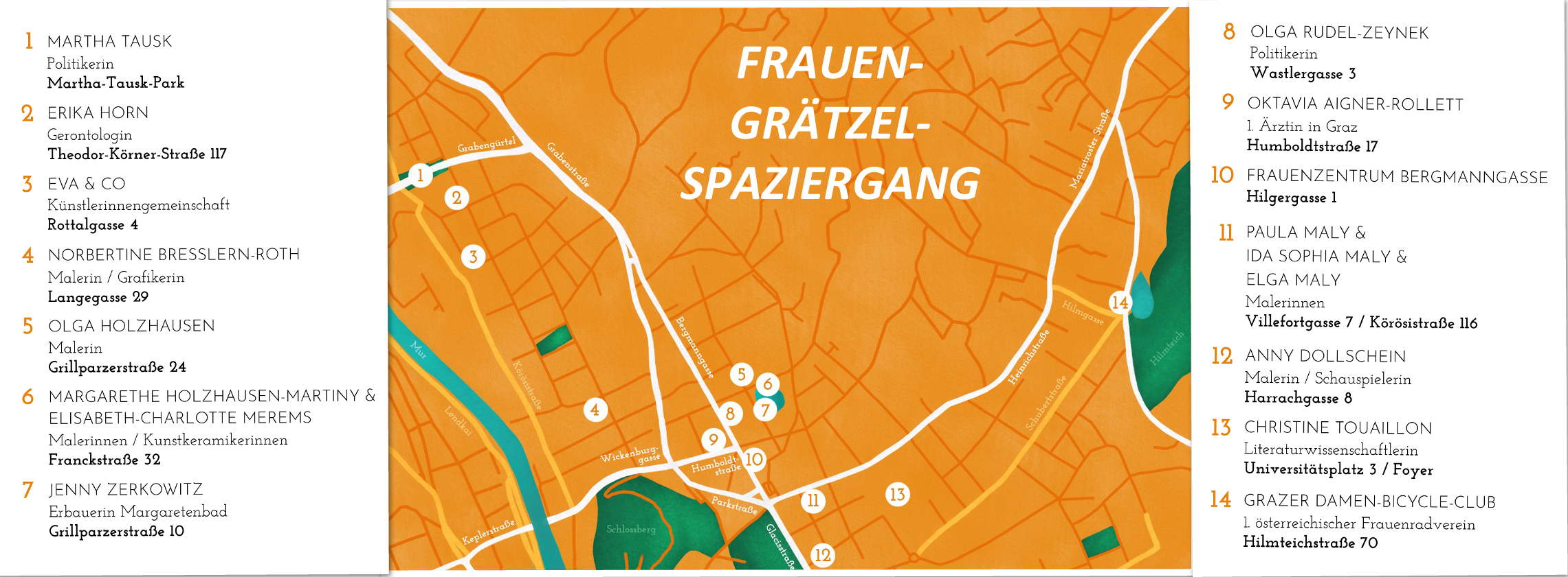 Der Frauen-Grätzelspaziergang entwickelt sich laufend weiter. Neue Stationen mit den Schicksalen von Frauen in Geidorf werden digital ergänzt bzw. gibt es neue thematische Schwerpunkte wie z.B. im Steirischen Herbst 2020: Der Nationalsozialismus und die Frauen von Geidorf. Von BDM bis Theresienstadt oder Stolpersteine für Frauen in Geidorf oder mit Drin Gudrun Danzer von der Neuen Galerie zu den Ladies first! im Grätzel. Mit den Gender-Studis der Uni Graz machten wir 2023 und 2024 eine Spurensuche nach Frauen im öffentlichen Raum: Von Biografien bekannter Persönlichkeiten über Ereignisse der Frauengeschichte bis zu Denkmälern und Straßennamen mit Brigitte Dorfer und Claudia Beiser